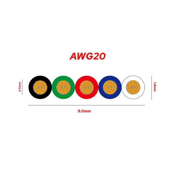 10 Meter 5 aderige RGBW stroomkabel op rol. De gewenste draaddikte (AWG) is te kiezen in het pulldownmenu.