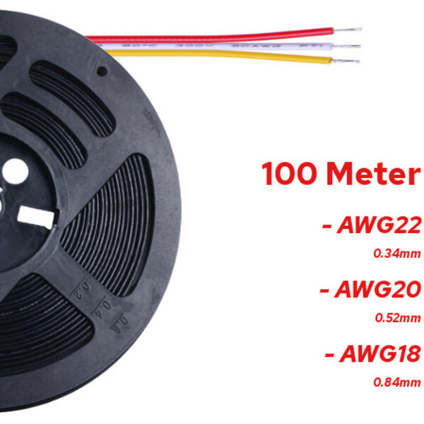 100 Meter 3 aderige stroomkabel op rol. De gewenste draaddikte (AWG) is te kiezen in het pulldown menu.