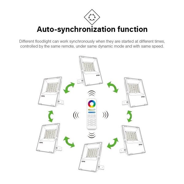 Deze multikleur bouwlamp heeft een interne ontvanger voor de afstandsbediening. Het maximale bereik tussen beide is 30 meter. Daarnaast heeft de floodlight ook een interne zender. Deze zendt het ontvangen signaal door naar de volgende lamp. Bij het gebruik van meerdere lampen wordt het bereik vergroot waardoor een lamp op 100 meter afstand probleemloos aan te sturen is. Zelfs als de lamp niet is gekoppeld in dezelfde zone als voorgaande lampen werkt dit vlekkeloos.