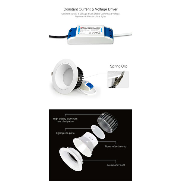 De LED-Downlight is zeer gemakkelijk te installeren en te besturen via de Mi-Light RGB + CCT afstandsbediening. Om de lamp te koppelen met de afstandsbediening via 2.4GHz RF, dient u er eerst voor de zorgen dat de lamp uit staat. U zet vervolgens de lamp aan en klikt binnen 3 seconden 3 keer op de gewenste zone-knop. Het koppelen is klaar als het licht drie keer groen knippert. Wilt u de LED-lamp van Mi-Light ontkoppelen? Schakel dan het licht uit en weer aan en druk binnen 3 seconden 5 keer snel op de juiste zone. Bij slagen zal de lamp rood gaan knipperen.