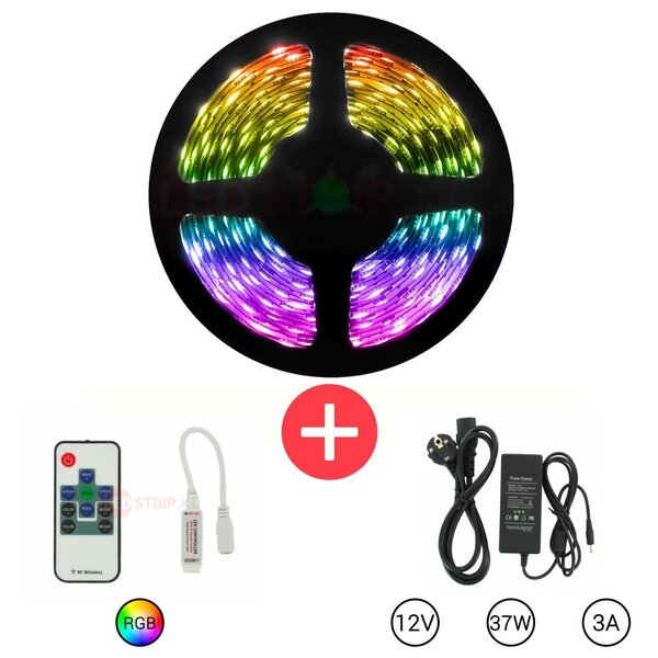 5 Meter RGB LEDstrip set met Afstandsbediening en Stroomadapter