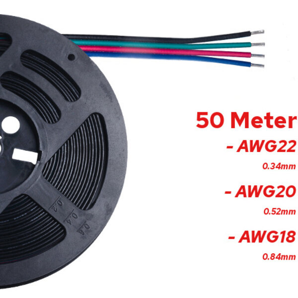 50 Meter 4 aderige RGB stroomkabel op rol. De gewenste draaddikte (AWG) is te kiezen in het pulldownmenu.