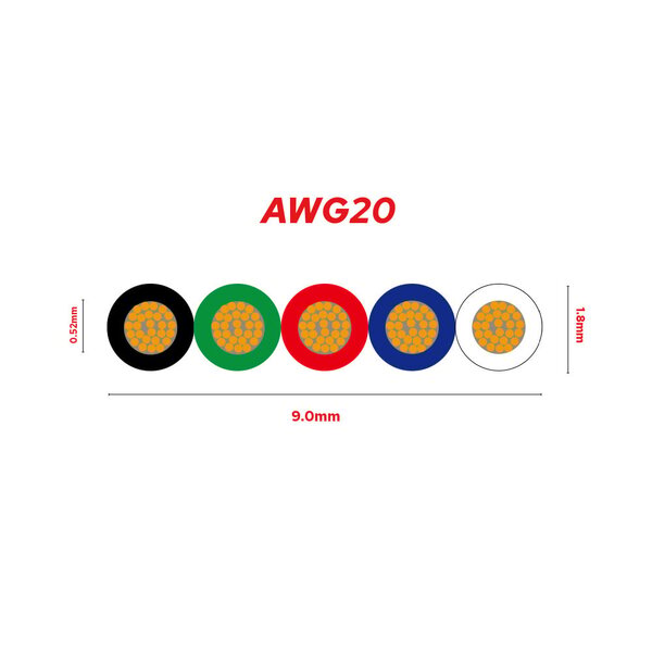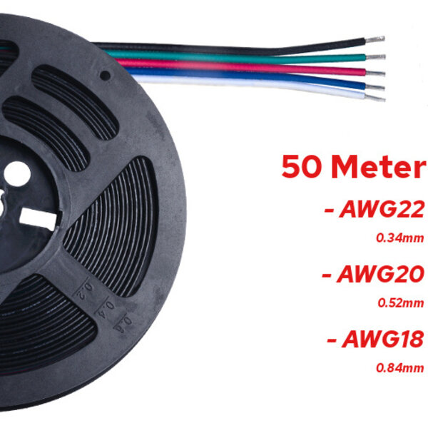 50 Meter 5 aderige RGBW stroomkabel op rol. De gewenste draaddikte (AWG) is te kiezen in het pulldownmenu.