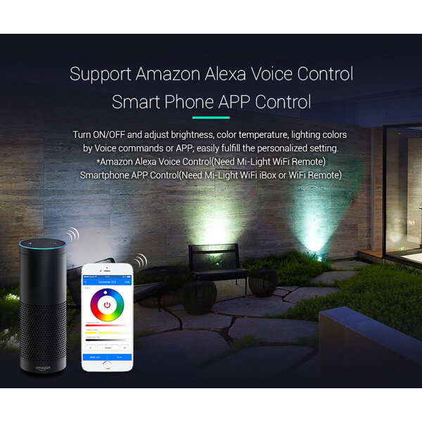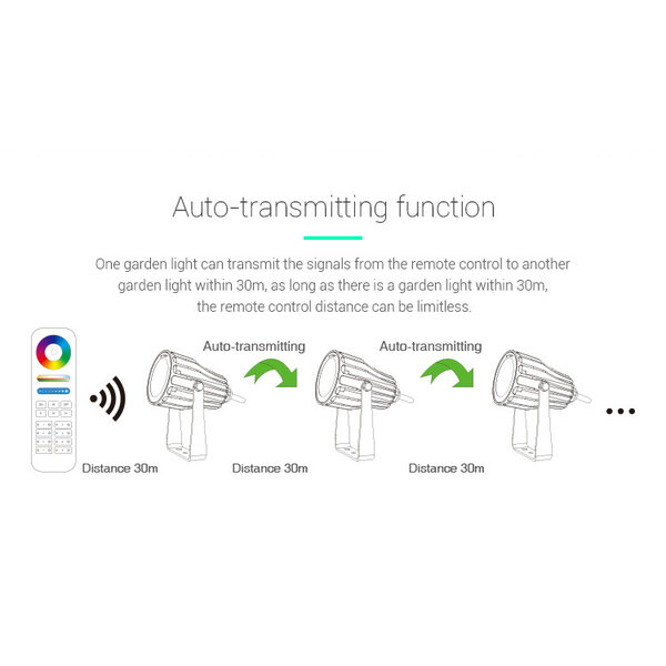 Het 2.4Ghz draadloze signaal wat de tuin lamp ontvangt, heeft een bereik van 30 meter. U kan deze lamp dus tot 30 meter bedienen. Dit kan zowel met de Mi-Light app, de FUT089 afstandsbediening of het B8 wandpaneel van Mi-Light.