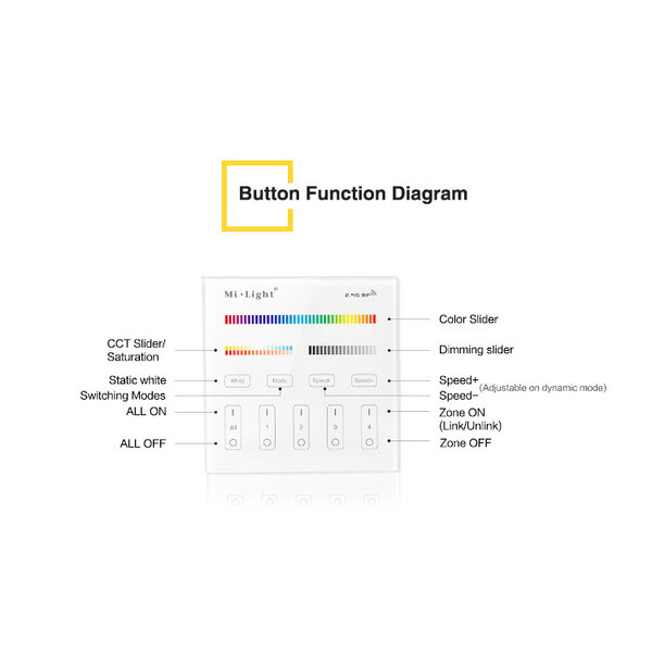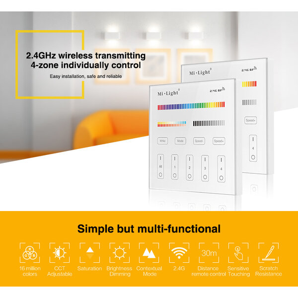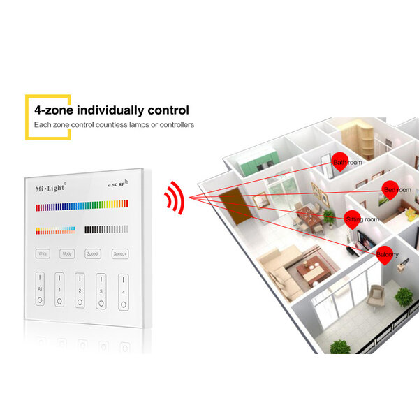 Het 4-zone wandpaneel is geschikt voor de specifieke Mi-Light producten, zoals de ledlampen, spots, downlights en schijnwerpers, maar ook voor RGB + Dual White ledstrips. Let op, hiervoor dient u wel gebruik te maken van een zonecontroller.