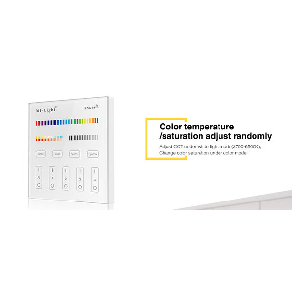 Koppel een eindeloos aantal aan lampen, ledstrips of downlights en controllers voor ledstrips aan het draadloze T4 wandpaneel van Mi-Light. U kunt deze koppelen aan één van de 4 diverse zones. Door gebruik te maken van het draadloze wandpaneel, kunt u zeer flexibel verschillende groepscombinaties creëren. Koppel bijvoorbeeld uw ledstrips per ruimte aan één zone en bedien deze door middel van het touch panel. U kunt de kleur en kleurtemperatuur regelen, maar ook de lichtsterkte en verzadiging. Daarnaast kunt u met één afstandsbediening een onbeperkt aantal lampen en controllers bedienen.