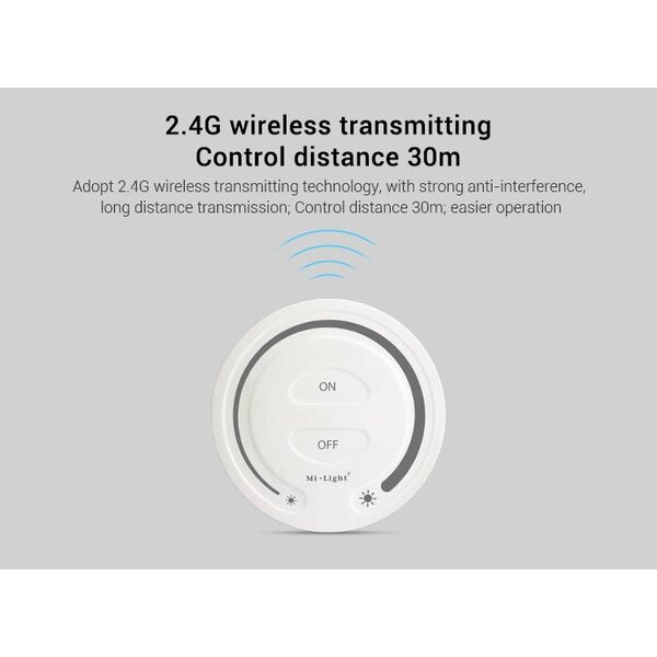 Dit draadloze wandpaneel van Milight is zeer simpel in gebruik. Het paneel beschikt over de aan/uit functie en een regelaar voor het dimmen van uw ledstrips. Het dimmen van uw led verlichting gaat zeer nauwkeurig door de instelbaarheid van 1% tot 100% vermogen.