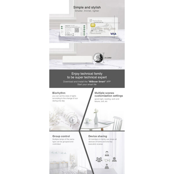 De nieuwe ledstrip zone controllers van MiBoxer, voorheen MiLight, hebben een ultra slank ontwerp. Met de afmeting van 7.4cm bij 3.6cm is hij vrij makkelijk weg te werken. Daarbij is deze controller slechts 1.7cm dik.