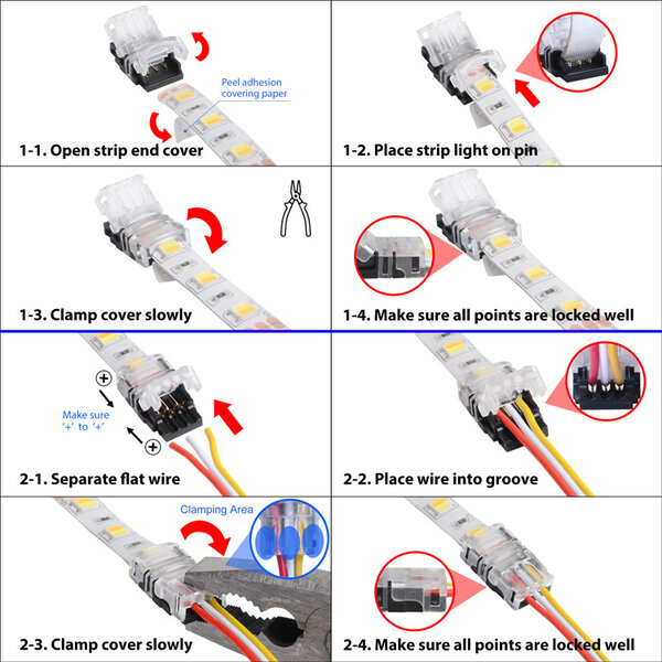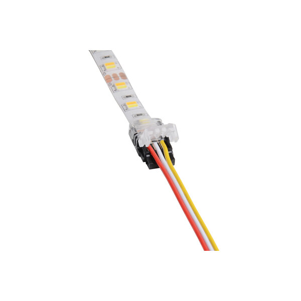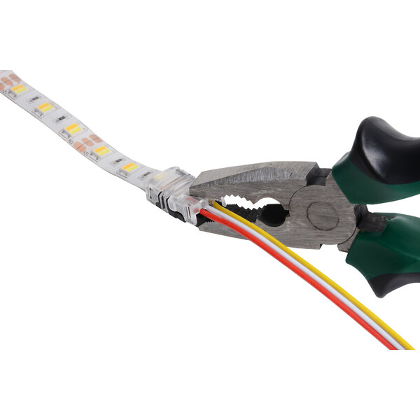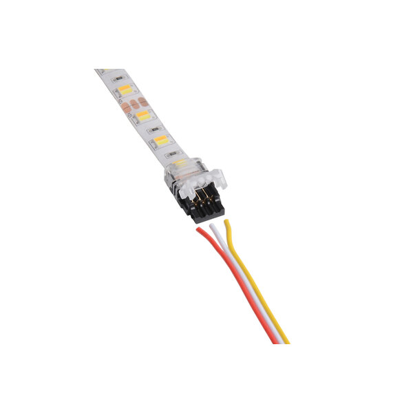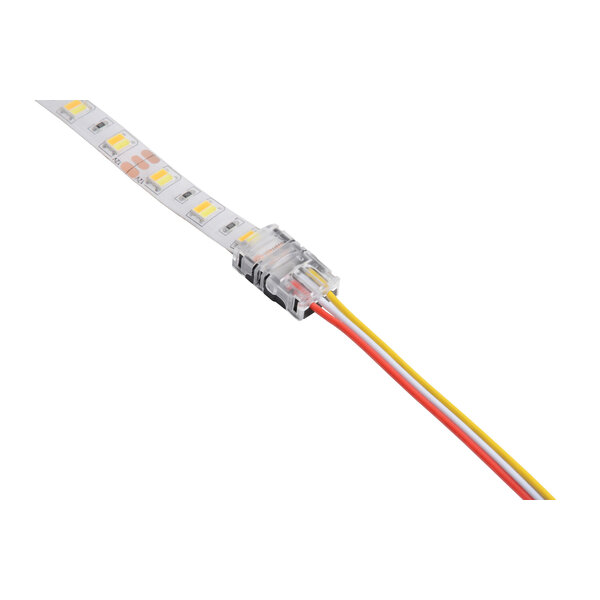 Rest stukken van afgeknipte Dual White LED Strips zijn nu nog eenvoudiger te hergebruiken met deze handige klik connector voor IP65 Dual WhiteLEDStrips van 10mm breed. Sluit aan de ene kant drie aderig stroomdraad aan voor het WW/CW+ Signaal zonder dat u hoeft te strippen en aan de andere kant de Dual WhiteLED Strip zonder dat u de IP65 coating hoeft te verwijderen!