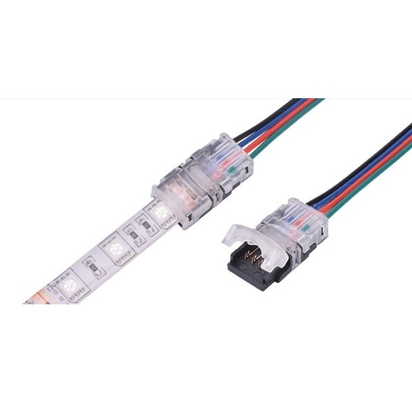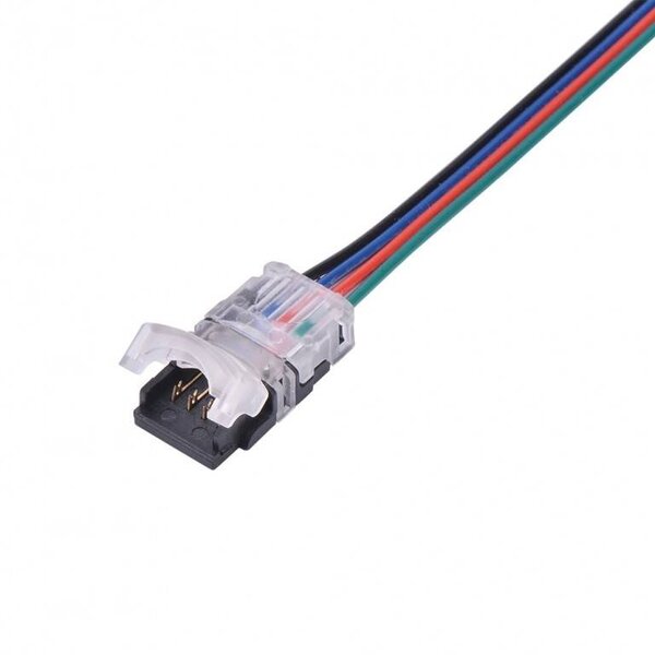 Rest stukken van afgeknipte RGB LED Strips zijn nu nog eenvoudiger te hergebruiken met deze handige klik connector voor IP65 RGB LEDStrips van 10mm breed. Sluit aan de ene kant vier aderig stroomdraad aan voor het RGB+ Signaal zonder dat u hoeft te strippen en aan de andere kant de RGB LED Strip zonder dat u de IP65 coating hoeft te verwijderen!