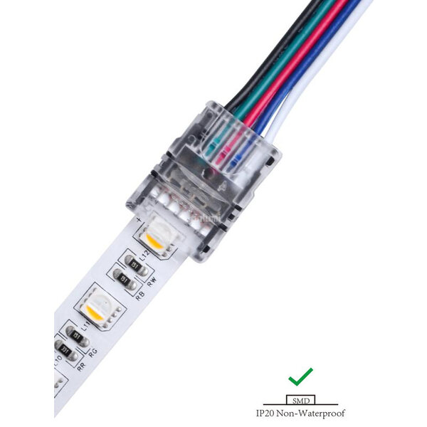 Rest stukken van afgeknipte RGBW LED Strips zijn nu nog eenvoudiger te hergebruiken met deze handige klik connector voor IP20 RGBW LEDStrips van 12mm breed. Sluit aan de ene kant 5 aderig stroomdraad aan voor het RGBW+ Signaal zonder dat u hoeft te strippen en aan de andere kant de RGBW LED Strip.