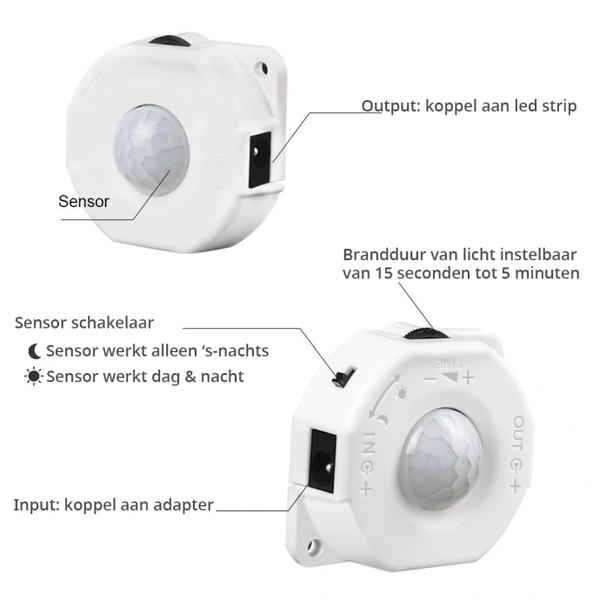 DC Ingang & Uitgang: Voorzie de bewegingssensor moeiteloos van stroom via de DC ingang, terwijl je tegelijkertijd je favoriete LED-strip aansluit op de DC uitgang.