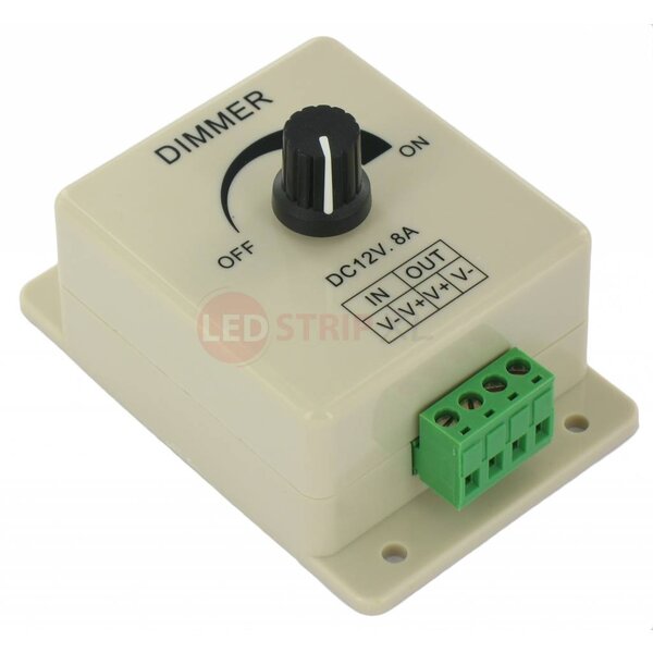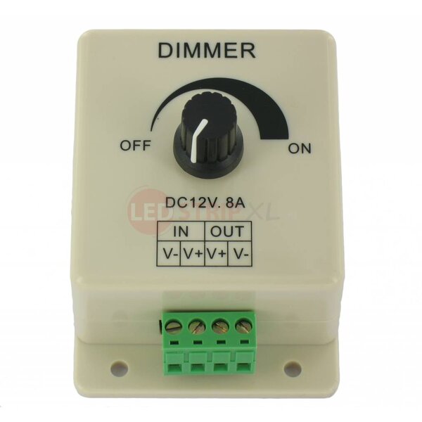 Deze opbouw dimmer is eenvoudig te plaatsen tussen een ledstrip voedingsadapter en een enkelkleurige ledstrip zonder dat u hiervoor hoeft te solderen. U kunt simpelweg de twee stroomdraden van een voeding of led strip strippen en deze met een schroevendraaier vastzetten op de dimmer.