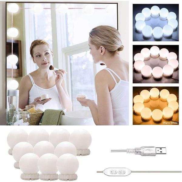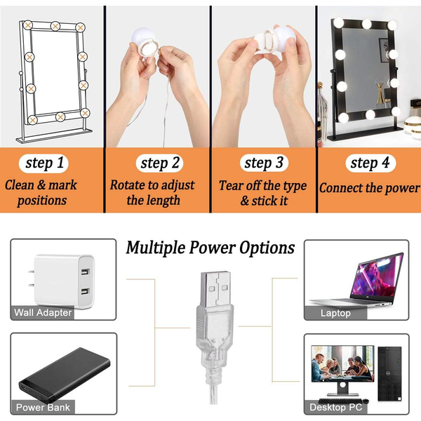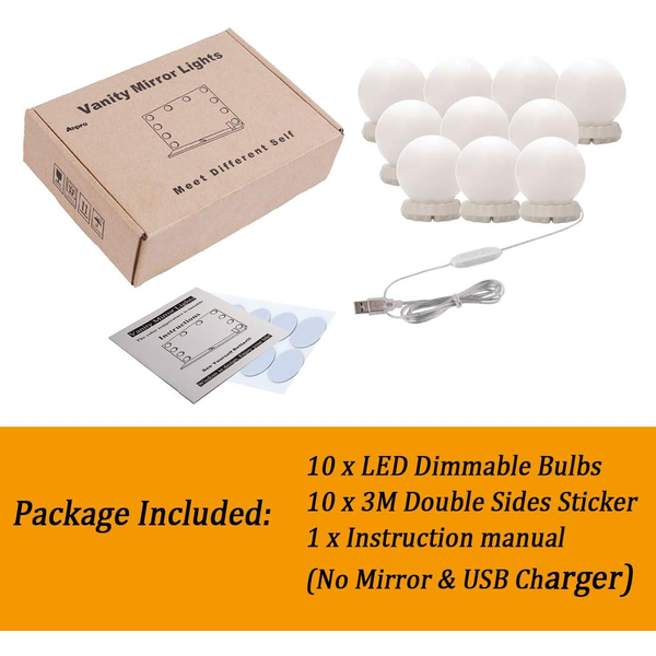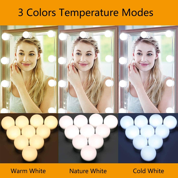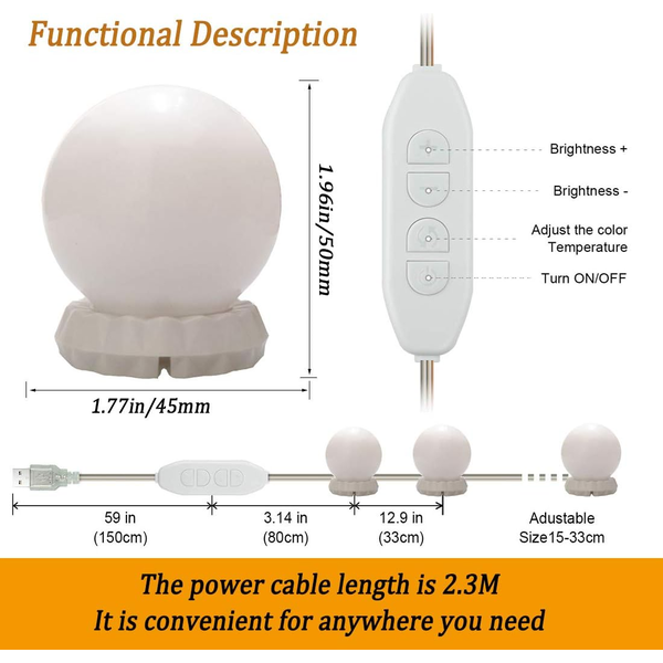 Verlicht je make-up met 10 dimbare LED-lampen in Hollywood-stijl. De zachte gloed, gecreëerd door de kogelvormige pc-lampenkappen, is vriendelijk voor je ogen. Pas de helderheid aan met de eenvoudige knoppen "+" en "-".