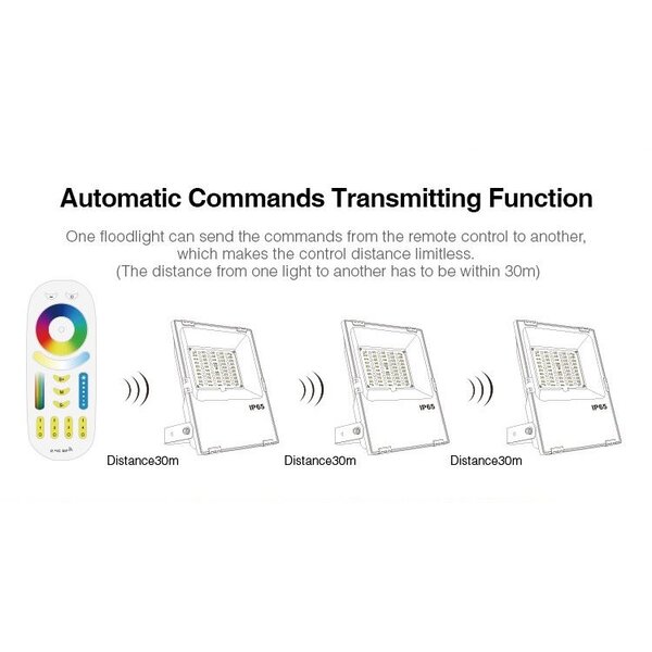 Deze multikleur bouwlamp heeft een interne ontvanger voor de afstandsbediening. Het maximale bereik tussen beide is 30 meter. Daarnaast heeft de floodlight ook een interne zender. Deze zendt het ontvangen signaal door naar de volgende lamp. Bij het gebruik van meerdere lampen wordt het bereik vergroot waardoor een lamp op 100 meter afstand probleemloos aan te sturen is. Zelfs als de lamp niet is gekoppeld in dezelfde zone als voorgaande lampen werkt dit vlekkeloos.