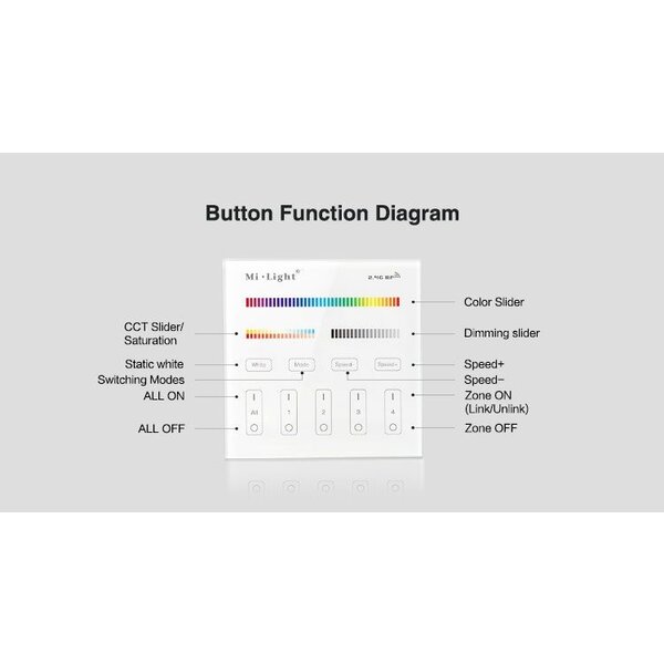 Het 4-zone wandpaneel is geschikt voor de specifieke Mi-Light producten, zoals de ledlampen, spots, downlights en schijnwerpers, maar ook voor RGB + Dual White ledstrips. Let op, hiervoor dient u wel gebruik te maken van een zonecontroller.