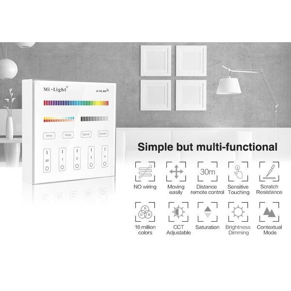 Koppel een eindeloos aantal aan lampen, ledstrips of downlights en controllers voor ledstrips aan het draadloze B4 wandpaneel van Mi-Light. U kunt deze koppelen aan één van de 4 diverse zones. Door gebruik te maken van het draadloze wandpaneel, kunt u zeer flexibel verschillende groepscombinaties creëren. Koppel bijvoorbeeld uw ledstrips per ruimte aan één zone en bedien deze door middel van het touch panel. U kunt de kleur en kleurtemperatuur regelen, maar ook de lichtsterkte en verzadiging. Daarnaast kunt u met één afstandsbediening een onbeperkt aantal lampen en controllers bedienen.