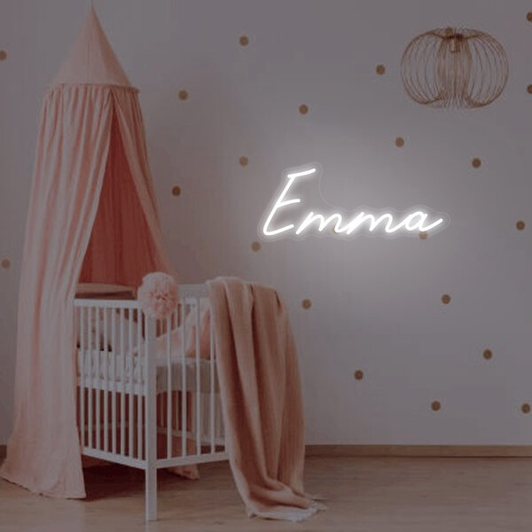 Met een afmeting van 50 cm breed bij 20 cm hoog, springt de naam 'Emma' in levendige LED-verlichting van het transparante acryl achtergrondbord. Emma is een van de meest populaire namen voor meisjes, en nu kun je je eigen stijlvolle stempel drukken met dit unieke decoratiestuk.