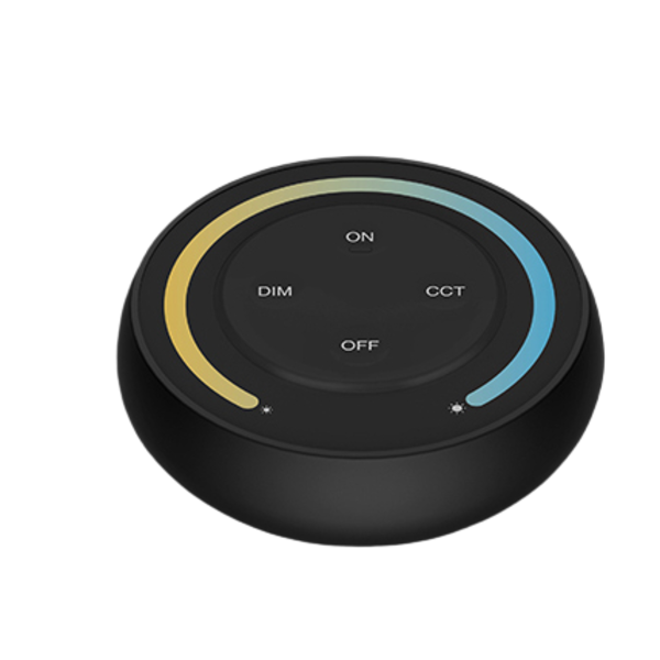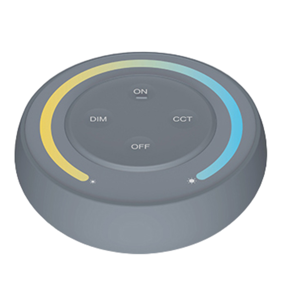 Met de ''On'' knop kan de verlichting worden ingeschakeld. Ook wordt deze knop gebruikt voor het koppelen van een nieuw product. De ''Off'' knop is er uiteraard om de verlichting uit te schakelen. De ''DIM'' knop wordt gebruikt om de dimmodus te activeren. Na het drukken op deze toets kan de ronde touch ring gebruikt worden om de intensiteit van de verlichting in te stellen. Klik je op de ''CCT'' button dan wordt de optie aangezet om de witkleur te bepalen. De gele kleur van de ring betekend dat er een warme kleur wordt ingesteld. Hoe verder je naar rechts gaat naar het blauwe zal de kleur steeds meer naar het koud wit verlopen.