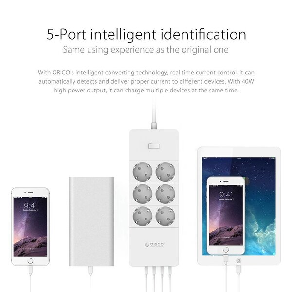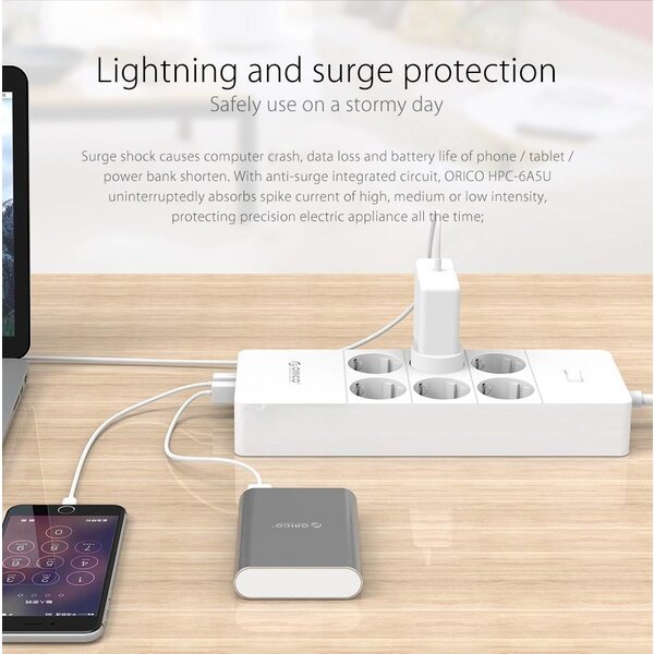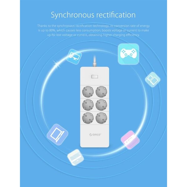Laadt gemakkelijk meerdere apparaten tegelijkertijd op met de stekkerdoos van Orico, dat beschikt over maar liefst zes stopcontacten en vijf USB-laadpoorten. Apparaten die tegelijkertijd opgeladen kunnen worden, zijn onder andere een smartphone, tablet, draagbare spelcomputer, digitale camera of mp3-speler. Dit zijn 5V apparaten die met de vijf USB-laadpoorten opgeladen kunnen worden. Laadt door middel van de stopcontacten je laptop op of laat bijvoorbeeld een gezellige lamp branden.