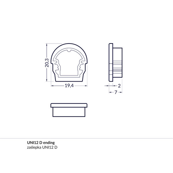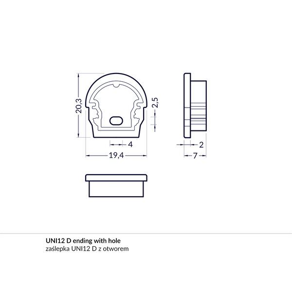 Zwarte Uni12 einddop voor Topmet profielen. Geschikt in combinatie met de ronde D cover van Topmet. Beschikbaar in open variant met draaddoorvoer en gesloten variant voor aan het einde van het profiel.