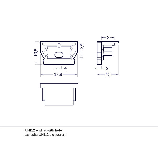Grijze einddop voor Uni12 profielen van Topmet. Beschikbaar in open variant met draaddoorvoer en gesloten variant voor aan het einde van het profiel.