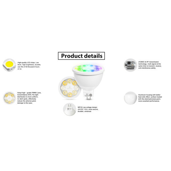 Naast dat deze full color 4 Watt MR16 spots aan te sturen zijn via het Zigbee protocol, zijn deze ook te bedienen met een fysieke afstandsbediening of wandpaneel. Deze bedieningen communiceren via een RF signaal met alle GLEDOPTO ledstrip controllers, lampen, spots, downlights, bouwlampen en tuinverlichting. Het wandpaneel heeft de mogelijkheid om 4 aparte groepen in te stellen. Met de afstandsbediening kunnen er 6 groepen apart van elkaar geschakeld worden.