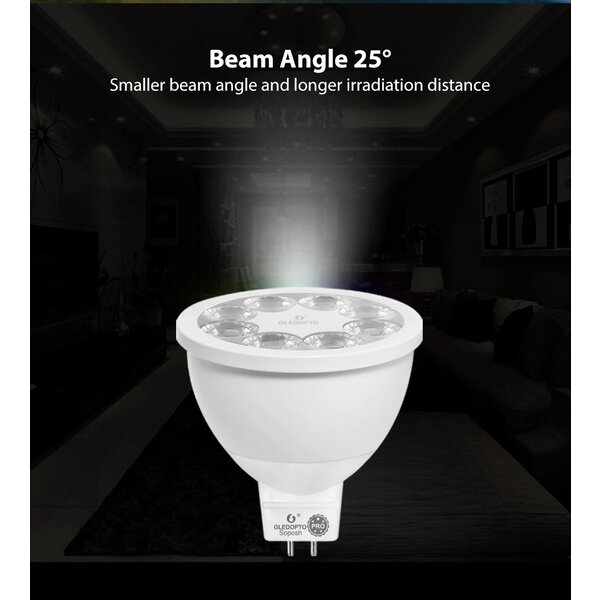 Deze 12 volt MR16 spot van GLEDOPTO heeft een sterke lens waardoor de lichtbundel beperkt blijft tot 25°. Dit houdt in dat de verlichting voornamelijk naar beneden gericht zal schijnen. Hierdoor zal er een sterk verlichte spot te zien zijn op de vloer. Deze 4 watt spot is uitermate geschikt om voorwerpen uit te lichten.