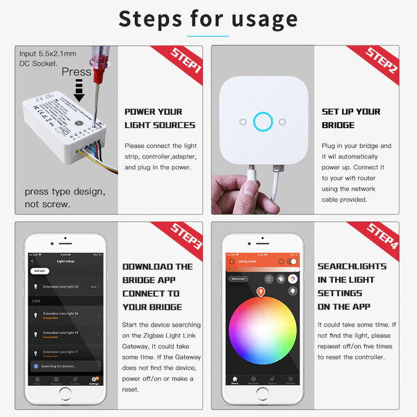 Deze Zigbee 3.0 ledstrip controller is te koppelen met onder andere Philips Hue*, SmartThings, Apple HomeKit en Google Assistant. Ook is het mogelijk om deze te bedienen met Ikea Trådfri, Osram Lightify en Amazon Echo. Via uw huidige smarthome app koppelt u deze eenvoudig aan uw bestaande lampen. * Niet alle functies in de app van Philips worden ondersteund.